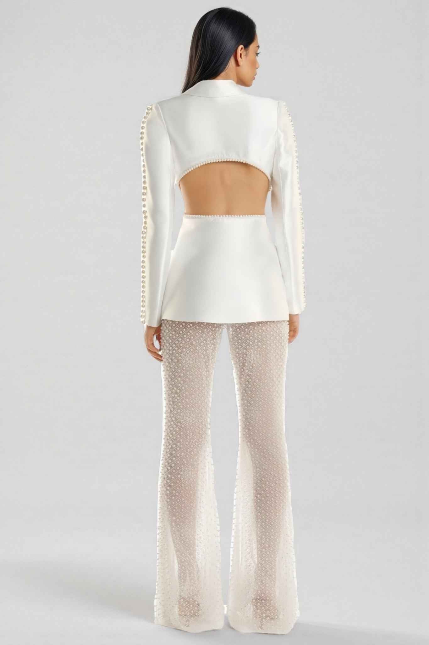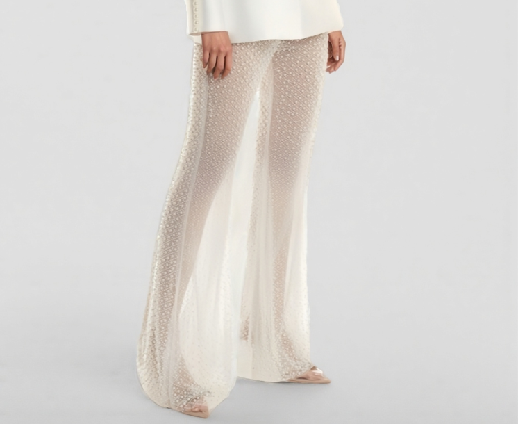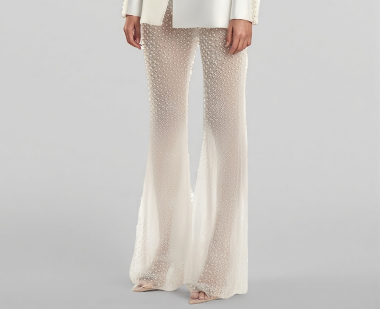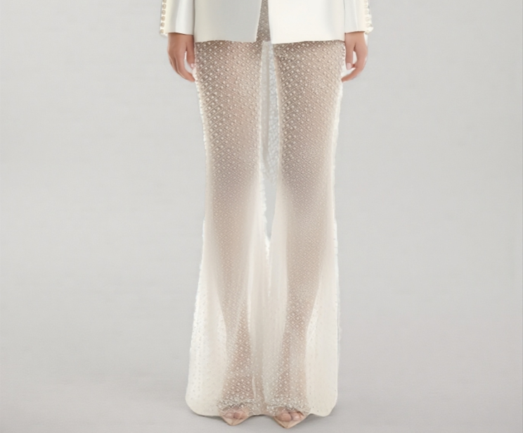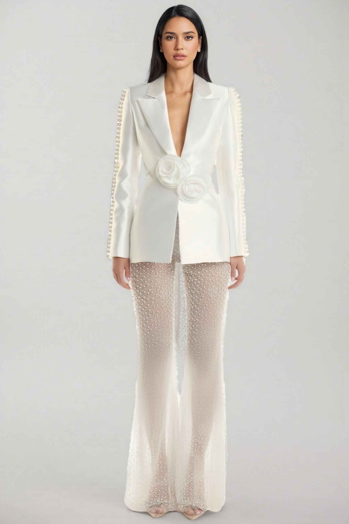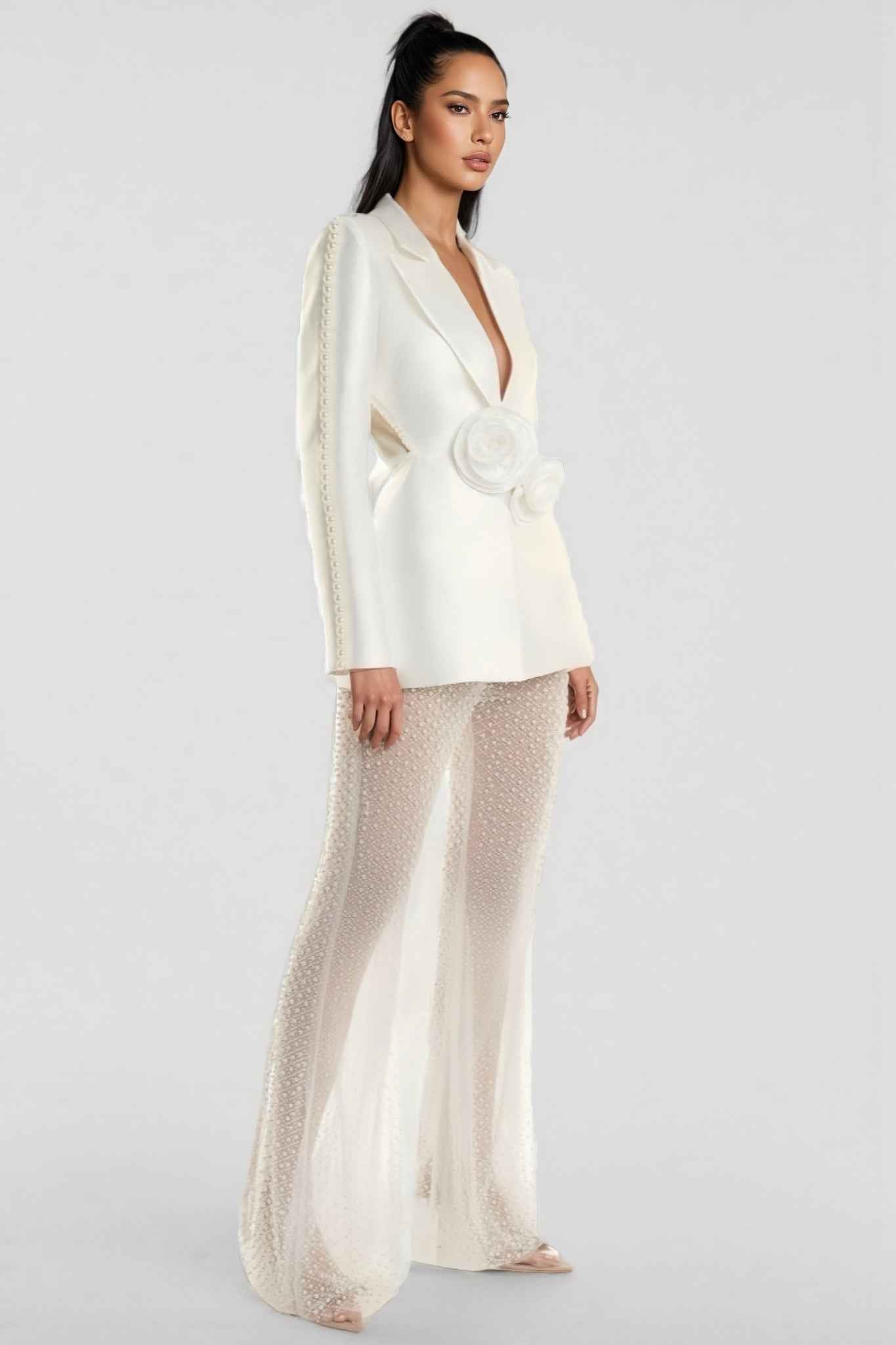 Design: 3D floral accents with intricate beading details, matching blazer + mesh trousers