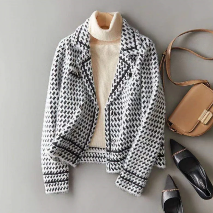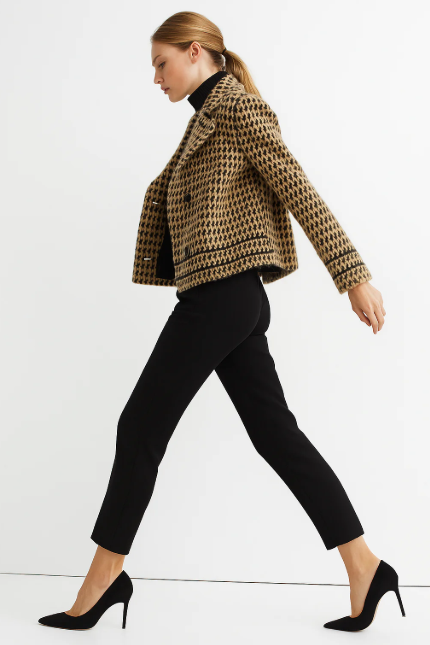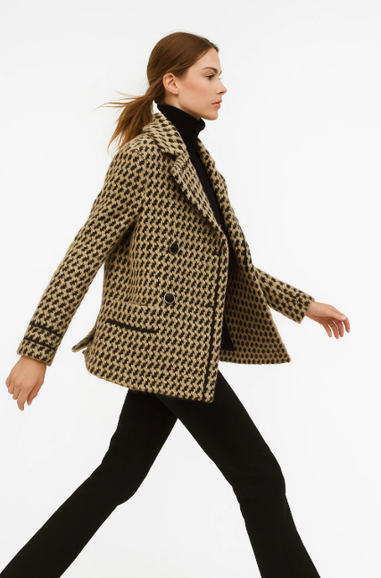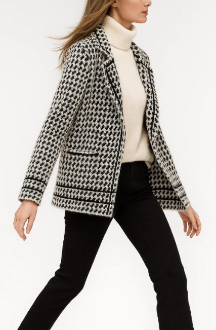 Design: Cropped Silhouette mit weichem Strickgewebe und markantem Hahnentritt-Dessin – kombiniert mit doppelreihigen Knöpfen für elegante Optik.