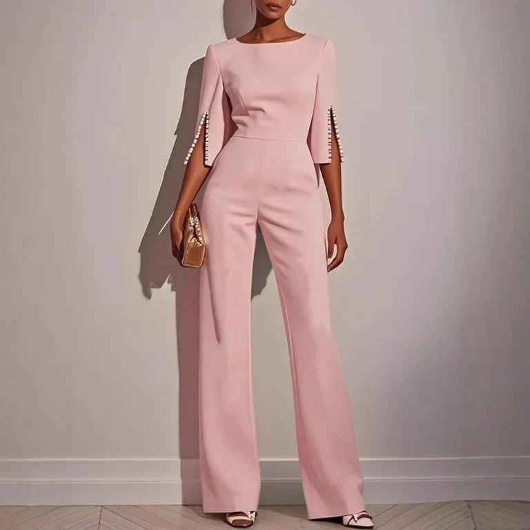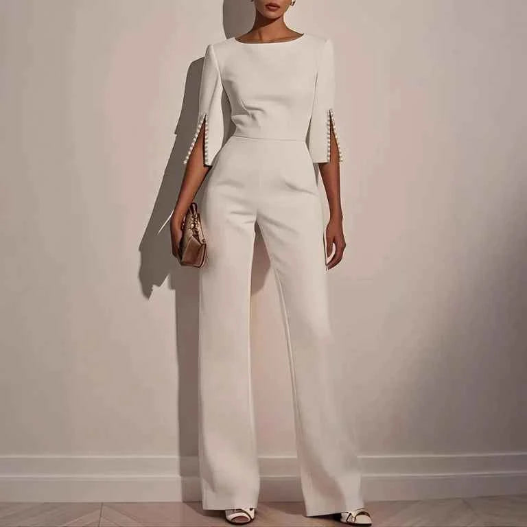 Du trägst diesen hochzeitsreifen Jumpsuit – klare Linien, betonte Taille und ein eleganter Fall für einen figurschmeichelnden Auftritt von Trauung bis Feier.